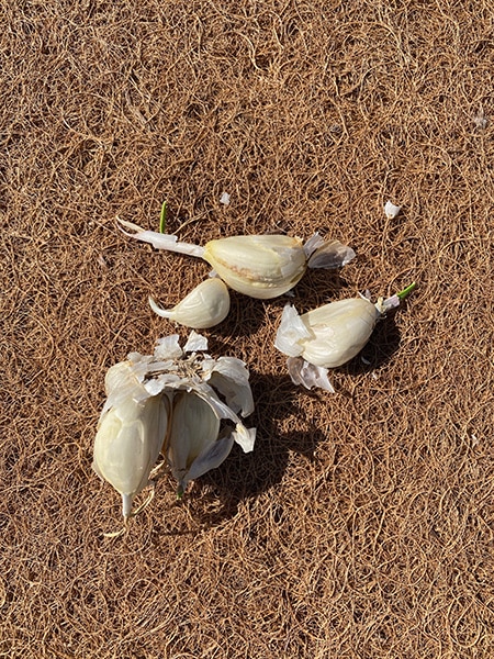 Pull your garlic, wipe the soil off with a cloth, and let them dry before storing in a paper sack.