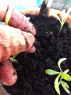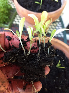 I use a bead sorter to remove the seedlings gently from the soil, then tease the roots apart and use a pencil to poke a hole in new soil in a new location.