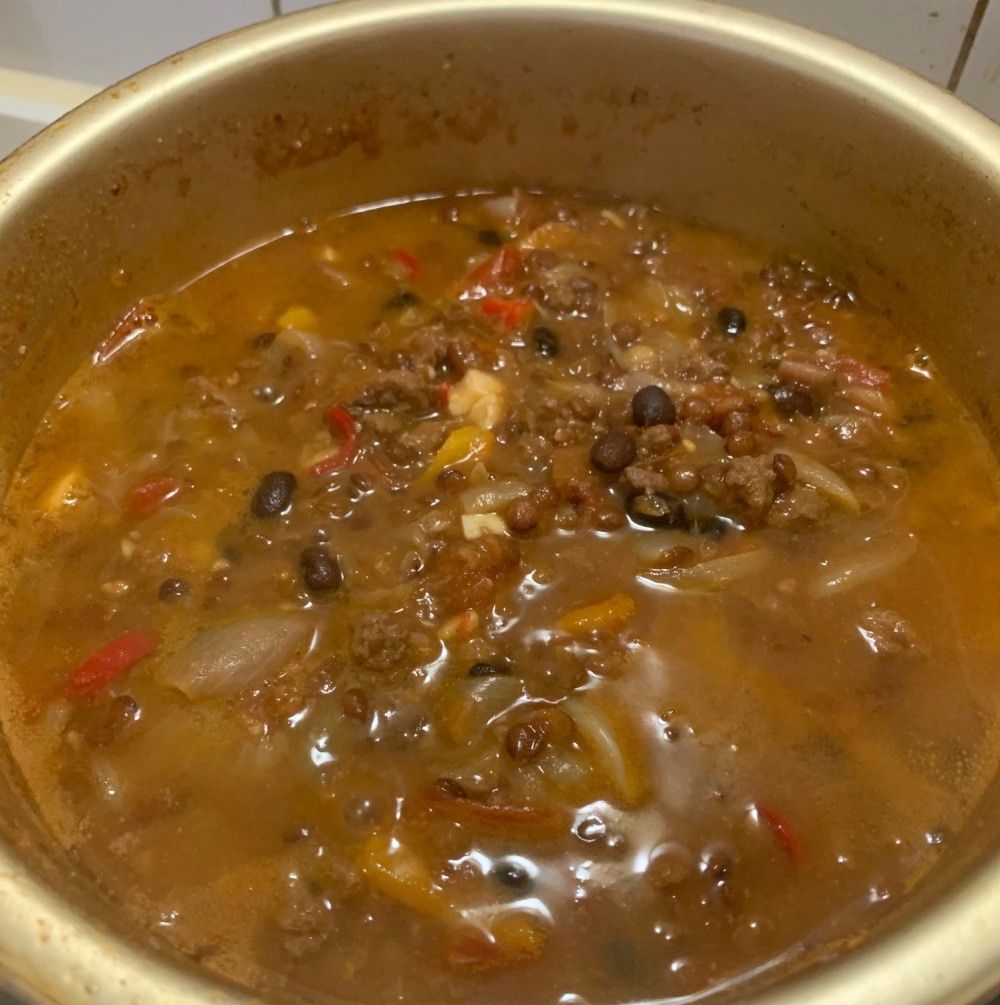 Add meat, onions, and veg to the pot you will be simmering in. Add your beans and lentils. Add just enough water/stock to cover everything. Finally add your seasonings and stir. I cover this and let it simmer for about an hour, checking occasionally to stir it and make sure it is not cooking over the pot. I may add more stock as I go but generally I don’t need to. If your chili is too wet after an hour, continue simmering on low heat uncovered. Be sure to check near the end if you want to add any additional seasonings to taste.