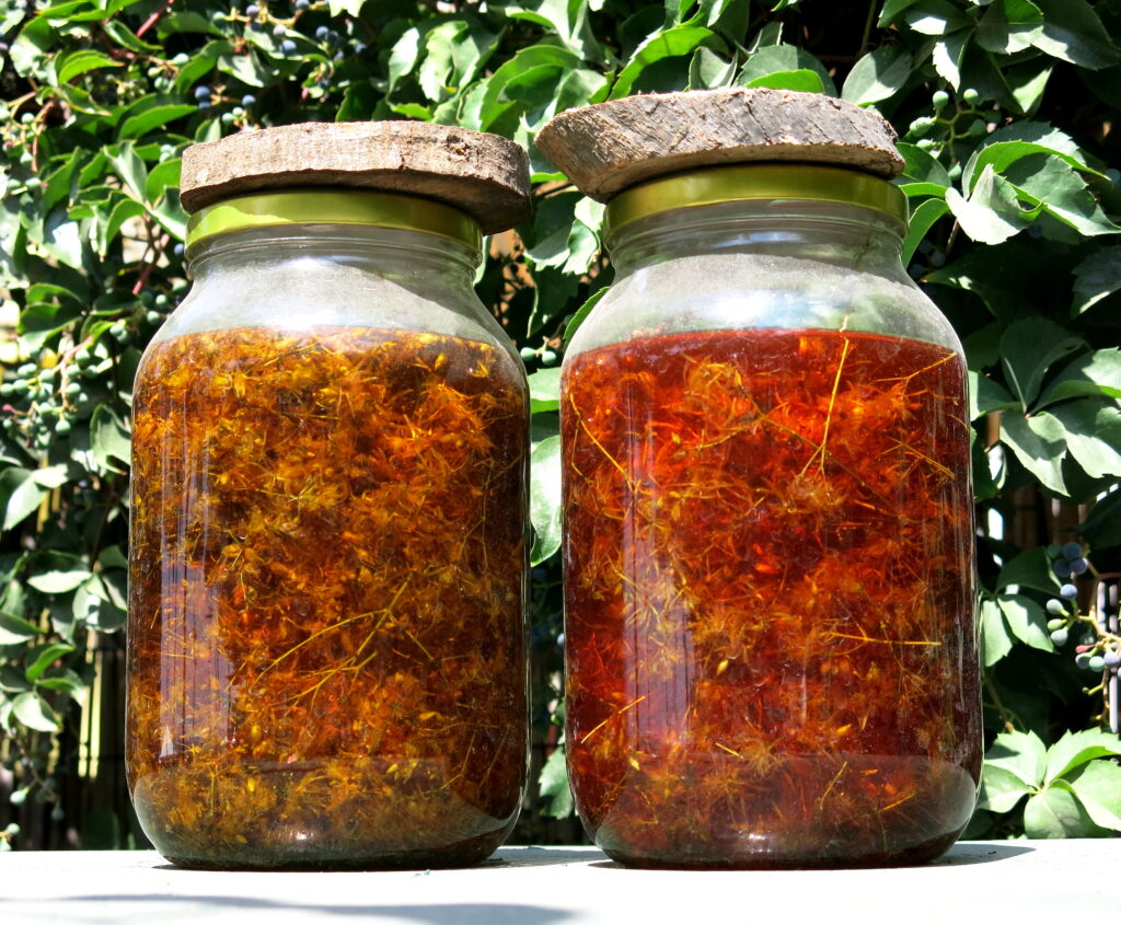 Extracting the beautiful yellow flowers into a carrier oil at the height of summer creates a rich red medicinal oil. This oil is used to treat skin troubles of all kinds, especially burns and nerve pain. Infused oil of St. John’s Wort (which is different from the Essential Oil) can be used directly on burns, minor wounds or rashes, insect bites, or any irritation.  This oil is helpful for all sorts of aches and pains, and can be added to massage oil for tense, achy neck and shoulders, or tension headaches. Add a few drops of Lavender essential oil to an ounce of infused St. John’s Wort oil for a delightful massage oil for tension and headaches.