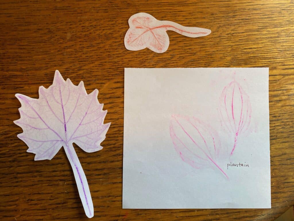 Once you have several rubbings, you can use a pen to write the name of the plant next to each rubbing.