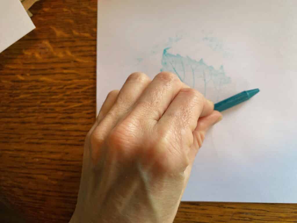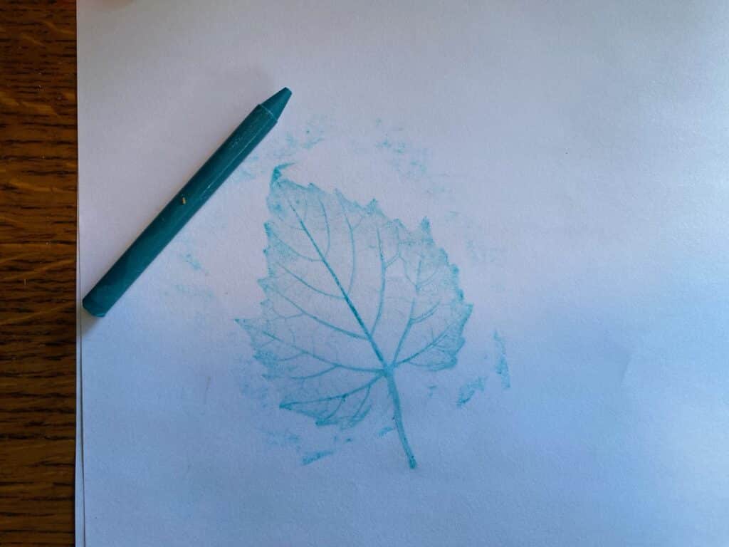Unpeel the paper on the crayons and gently rub them over the surface area of the leaf. You can feel the leaf with your fingers and rub around the edges to find the outlines.