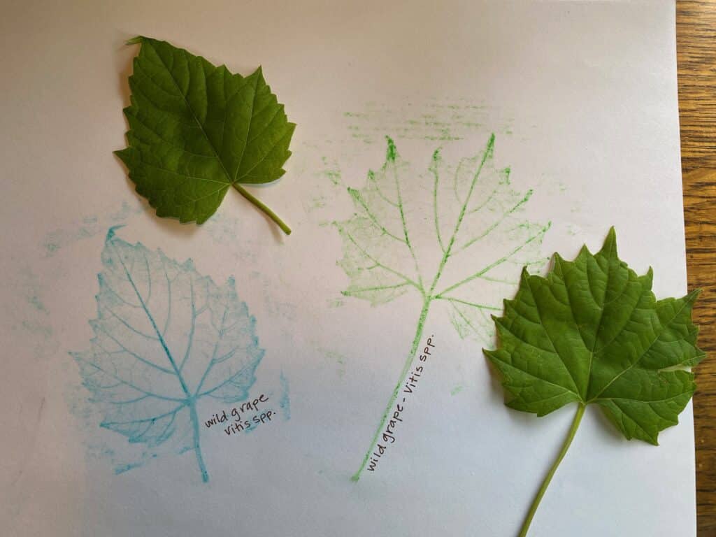 Once you have the basic supplies gathered, take your kids outside to gather leaves. Look for leaves that have good veins. Some of my favorite leaves for rubbing are strawberries, grapes, clover, and plantain.