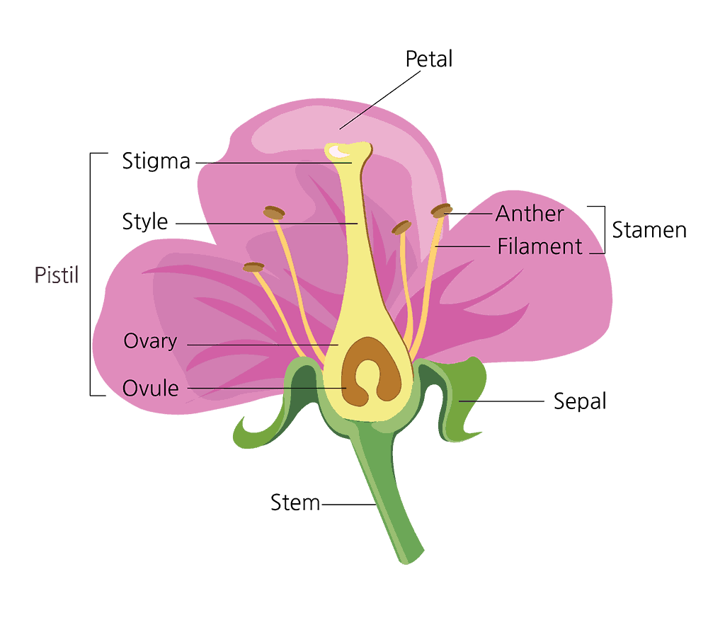 Flowering plants, or angiosperms, have, you guessed it, flowers! Different plant flowers may have all or be missing some flower parts but generally flowers contain a sepal, petals, pistol, and stamen. Sepals and petals are primarily utilized to attract pollinators or to protect the seed. The top of the stamen, the anther, produces pollen, and the pollen travels to the top of the pistol, traveling down to the ovary at the bottom where a seed will be produced.